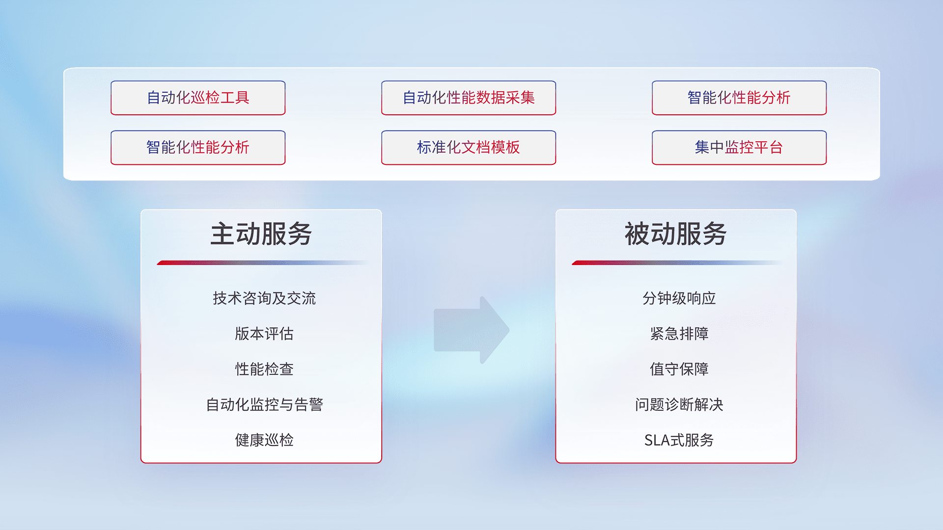 智能化工具和标准化文档,,保障服务质量,,,,提供主动服务(包含技术咨询、、版本评估、、性能检查、、自动化监控与告警、、健康巡检)和被动服务包含(分钟级响应、、、、紧急排障、、、值守保障、、、问题诊断解决、、、SLA服务)。。