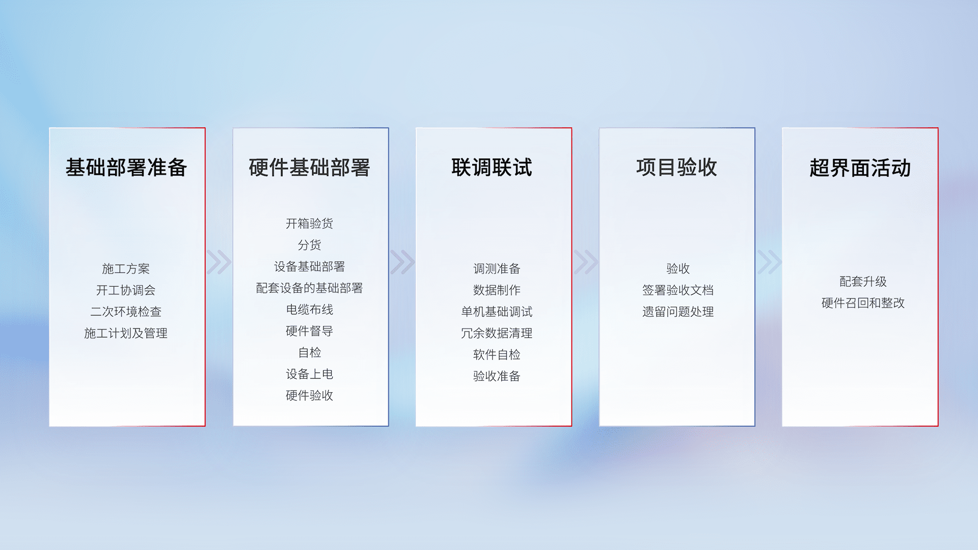 从基础部署准备、、、、硬件基础部署、、、联调联试、、项目验收、、越界面活动的全过程可追溯,,保证施工质量和进度。。